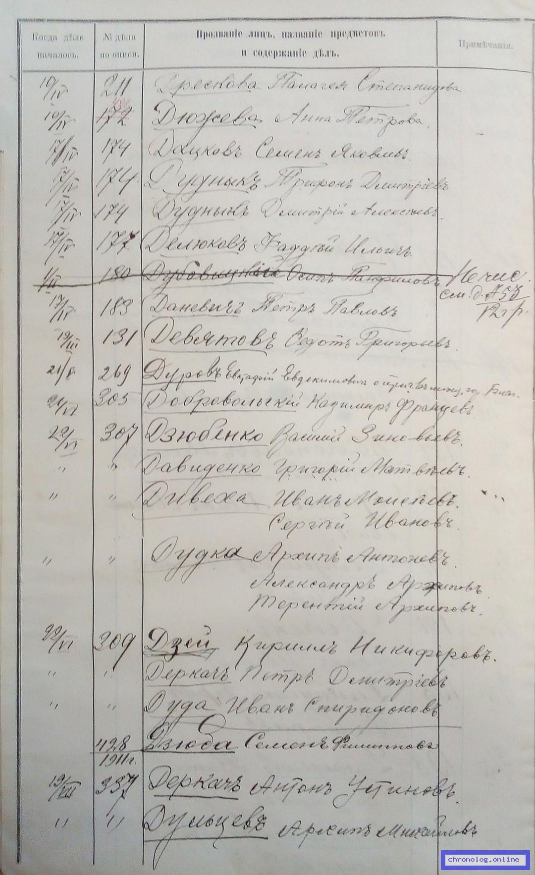 РГИАДВ 704-4-3230, Л.25об (Указатель дел переселенческой части за 1912 год): Дуров Евстафий Евдокимович показан со ссылкой на дело (старая опись, нумерация не действительная) №269 от 21.5.1912. Время и место исхода не показано. Снимки: 25об. | |||