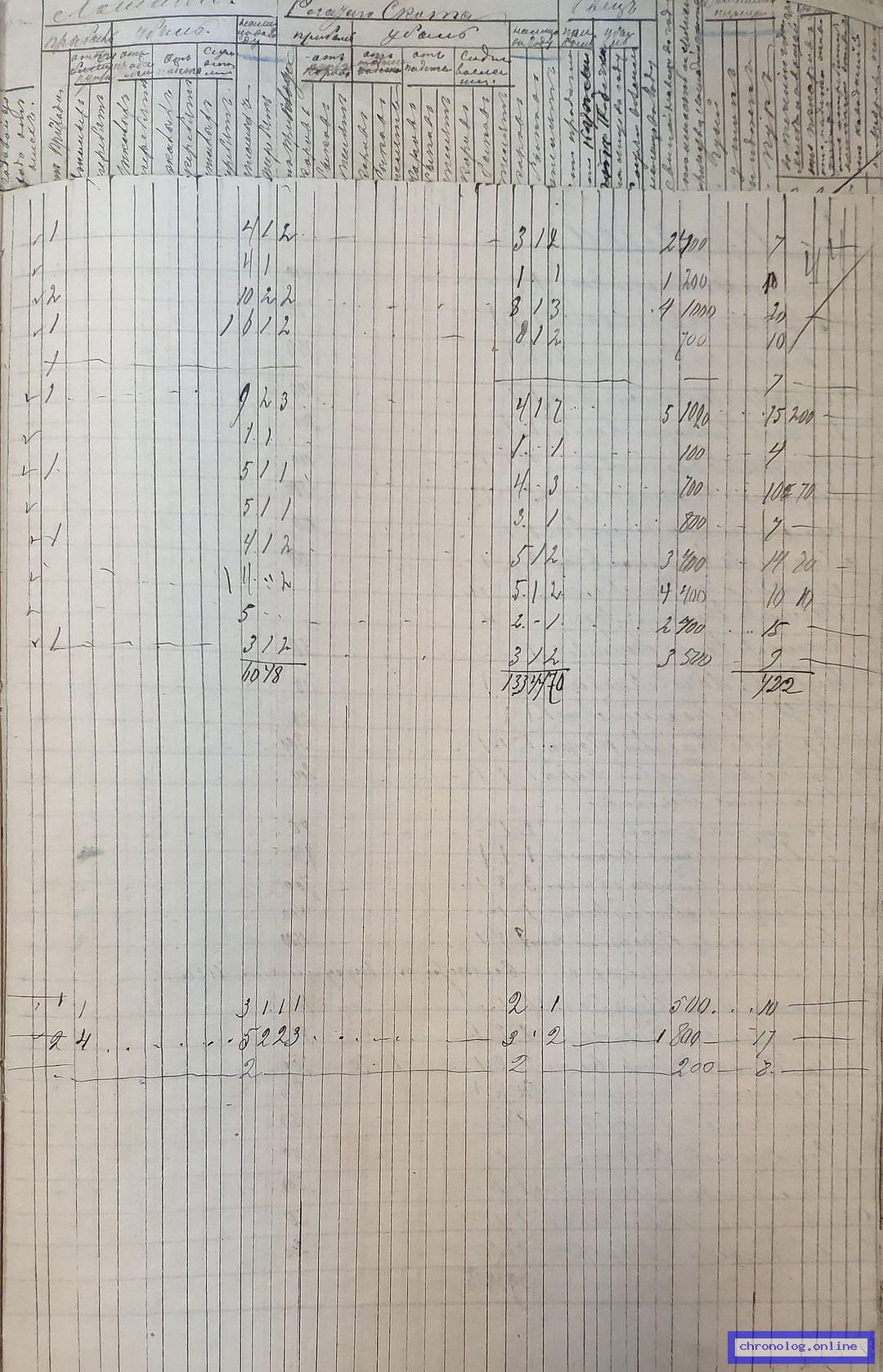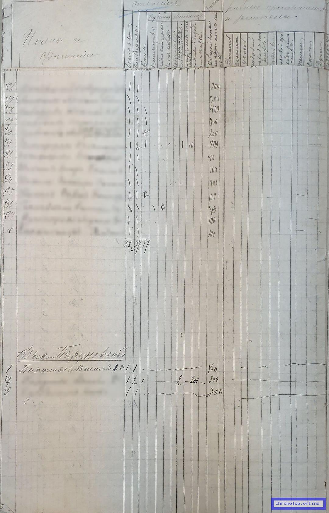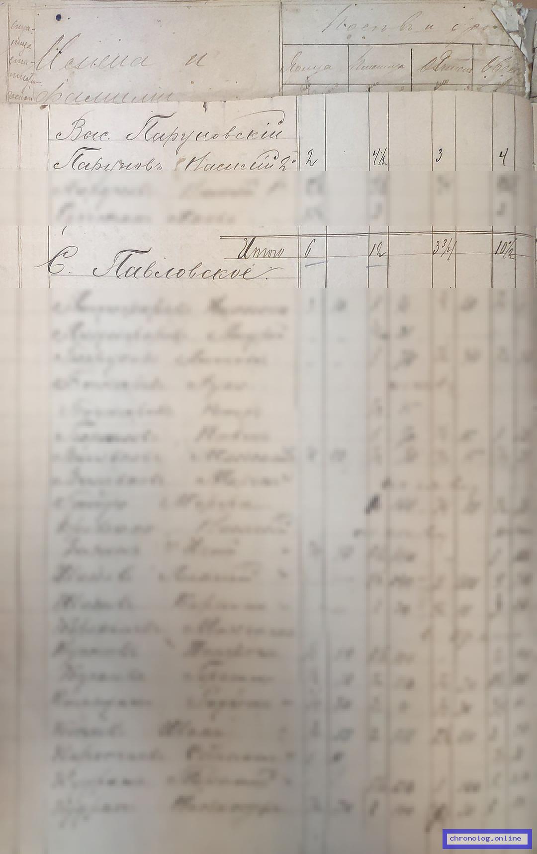РГИАДВ 746-1-37, Л.43об., 44, 98об., 99 (Сведения о крестьянских селениях и посеве хлеба на 1896 год): Хозяйство Парунова Василия-Второго второго: 1 дом, 2 амбара, 1 баня на 800 р., 4 лошади, 2 коровы, 2 быка, 3 телёнка, 1 свинья на 800 р.; посевы: ярицы 2, пшеницы 4 ½, ячменя 3, овса 4, гречи ¾, конопли ¼, картофеля 35, капусты 5, огурцов 2, моркови 3, свеклы 2. Время и место исхода не показано. Снимки: 43об, 44, 98об, 99. | |||
