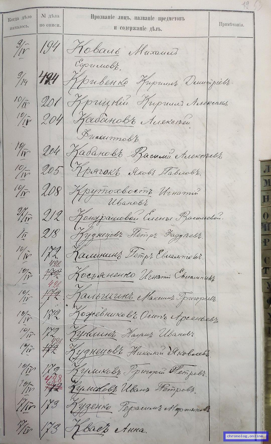РГИАДВ 704-4-3230, Л.53 (Указатель дел переселенческой части за 1912 год): Кожевников Осип Арсениевич показан со ссылкой на дело (старая опись, нумерация не действительная) №172 от 10.4.1912. Время и место исхода не показано. Снимки: 53. | |||
