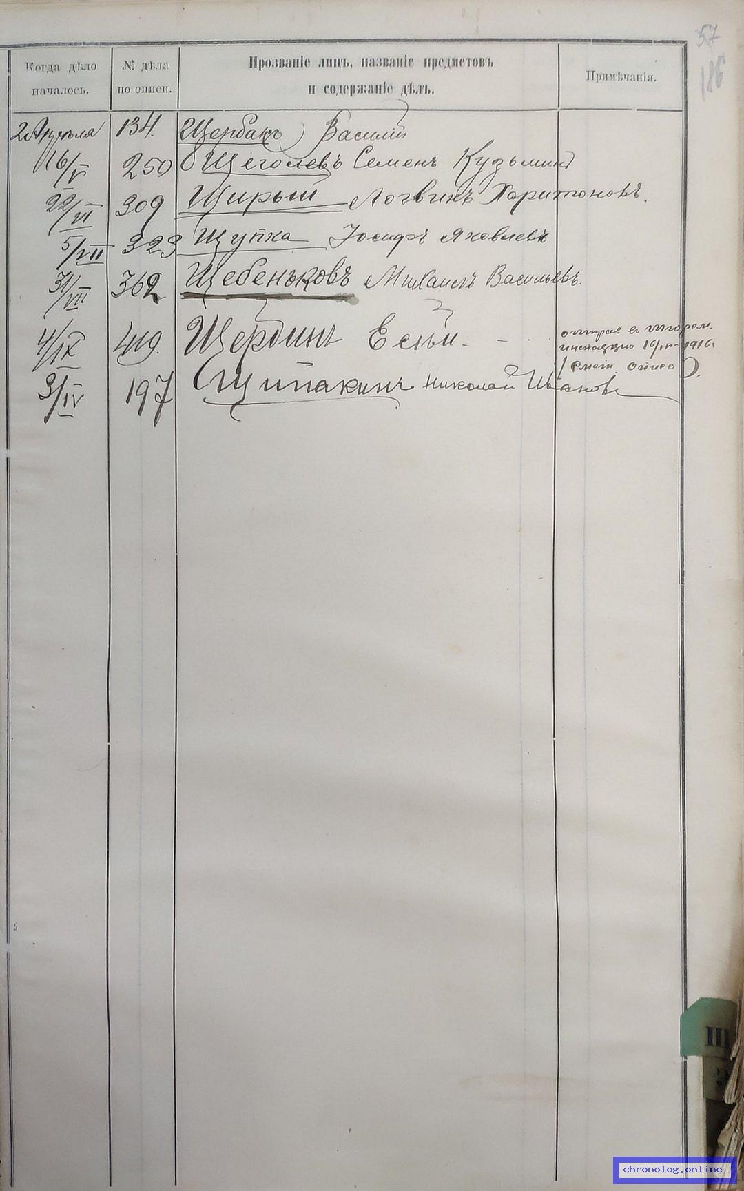 РГИАДВ 704-4-3230, Л.183об (Указатель дел переселенческой части за 1912 год): Шлыков Дмитрий Ефимович показан со ссылкой на дело (старая опись, нумерация не действительная) №378 от 2.8.1912. Время и место исхода не показано. Снимки: 183об. | |||