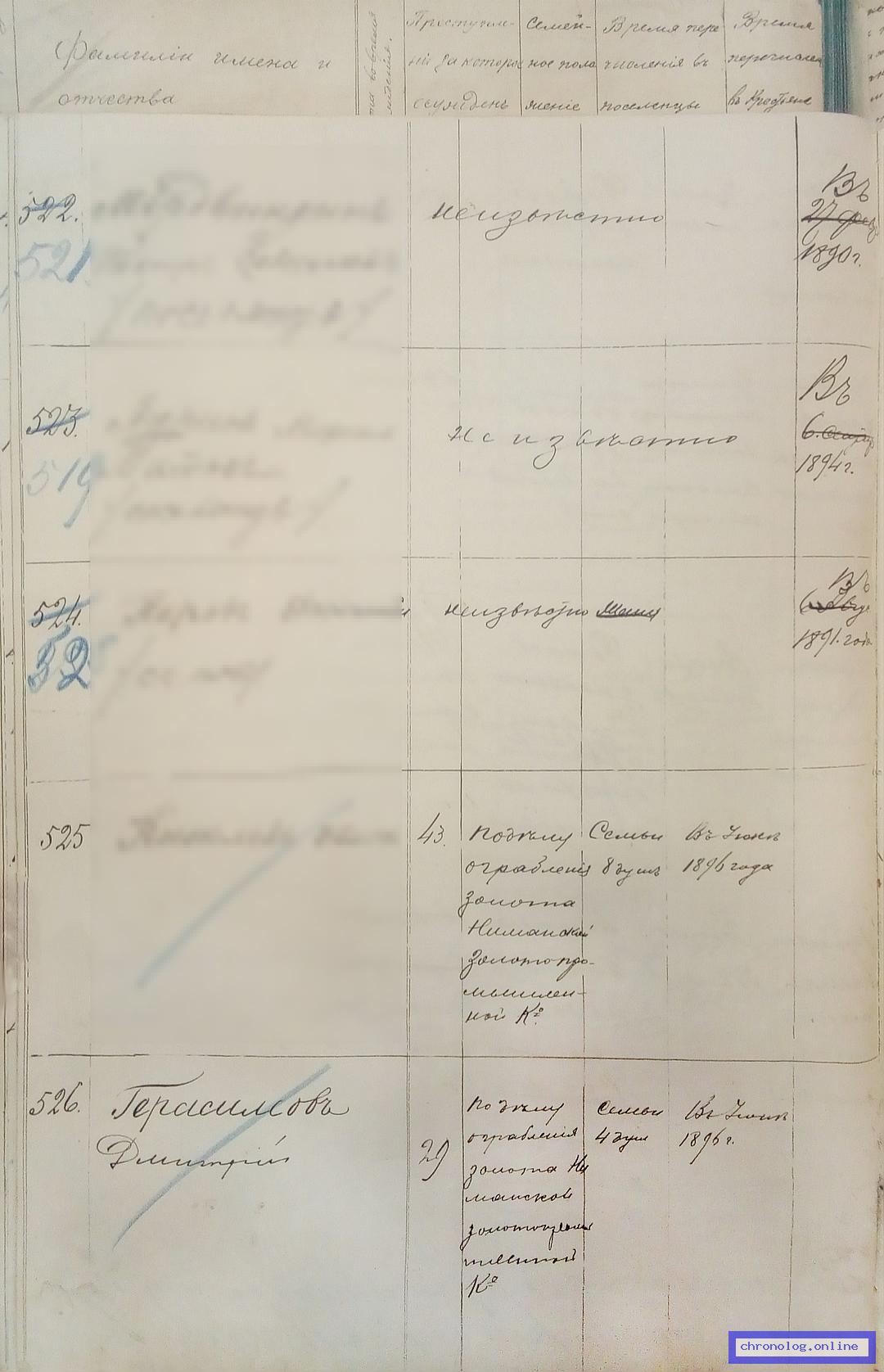 РГИАДВ 704-4-688, Л.75об., 76 (Список ссыльно-поселенцев, причисленных в Амурскую область в 1896 году): В сводной таблице показан поселенец Дмитрий Герасимов. Время и место исхода не показано. Снимки: 75об, 76. | |||