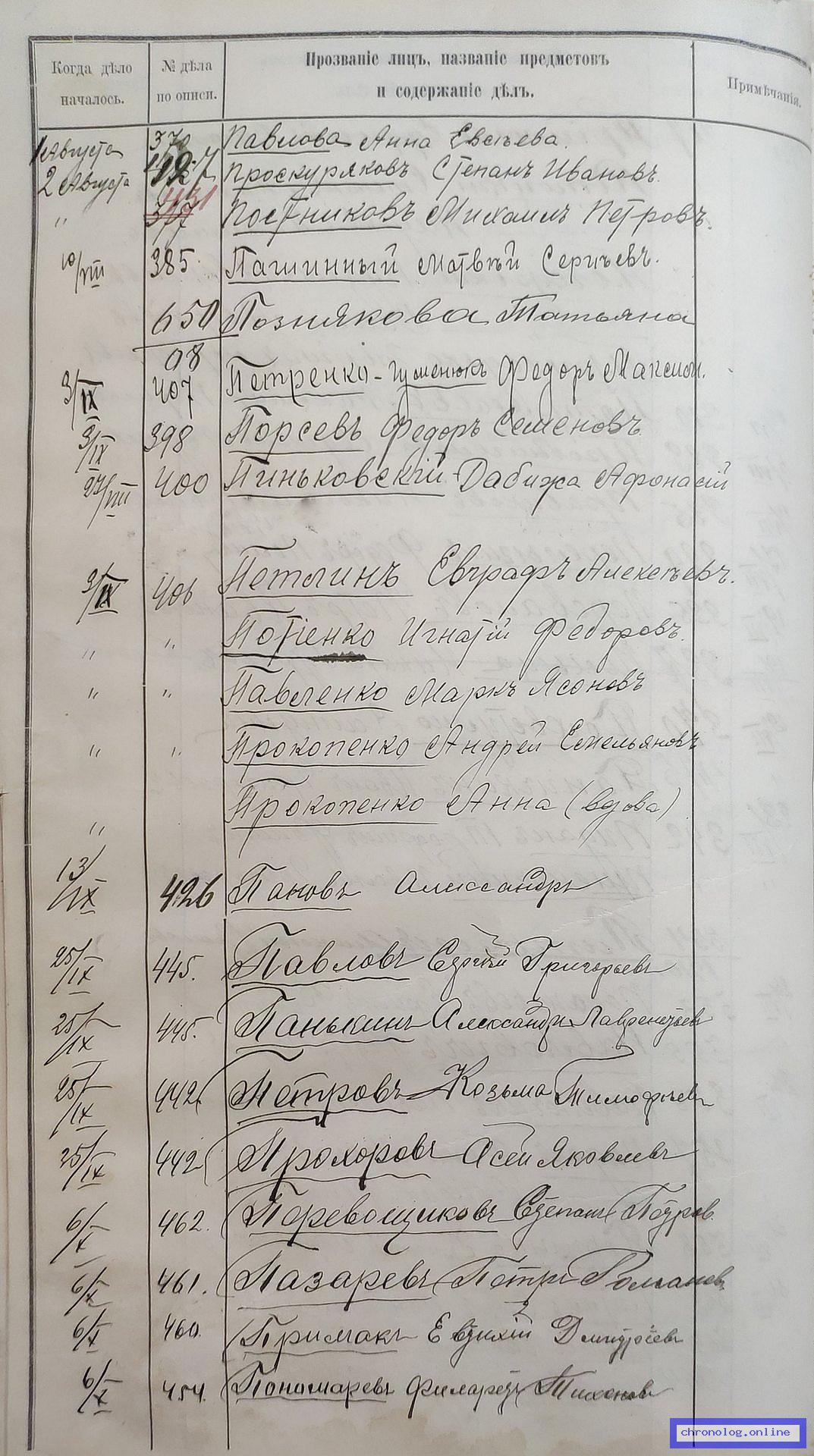 РГИАДВ 704-4-3230, Л.101об (Указатель дел переселенческой части за 1912 год): Павлов Сергей Григориевич показан со ссылкой на дело (старая опись, нумерация не действительная) №445 от 25.9.1912. Время и место исхода не показано. Снимки: 101об. | |||