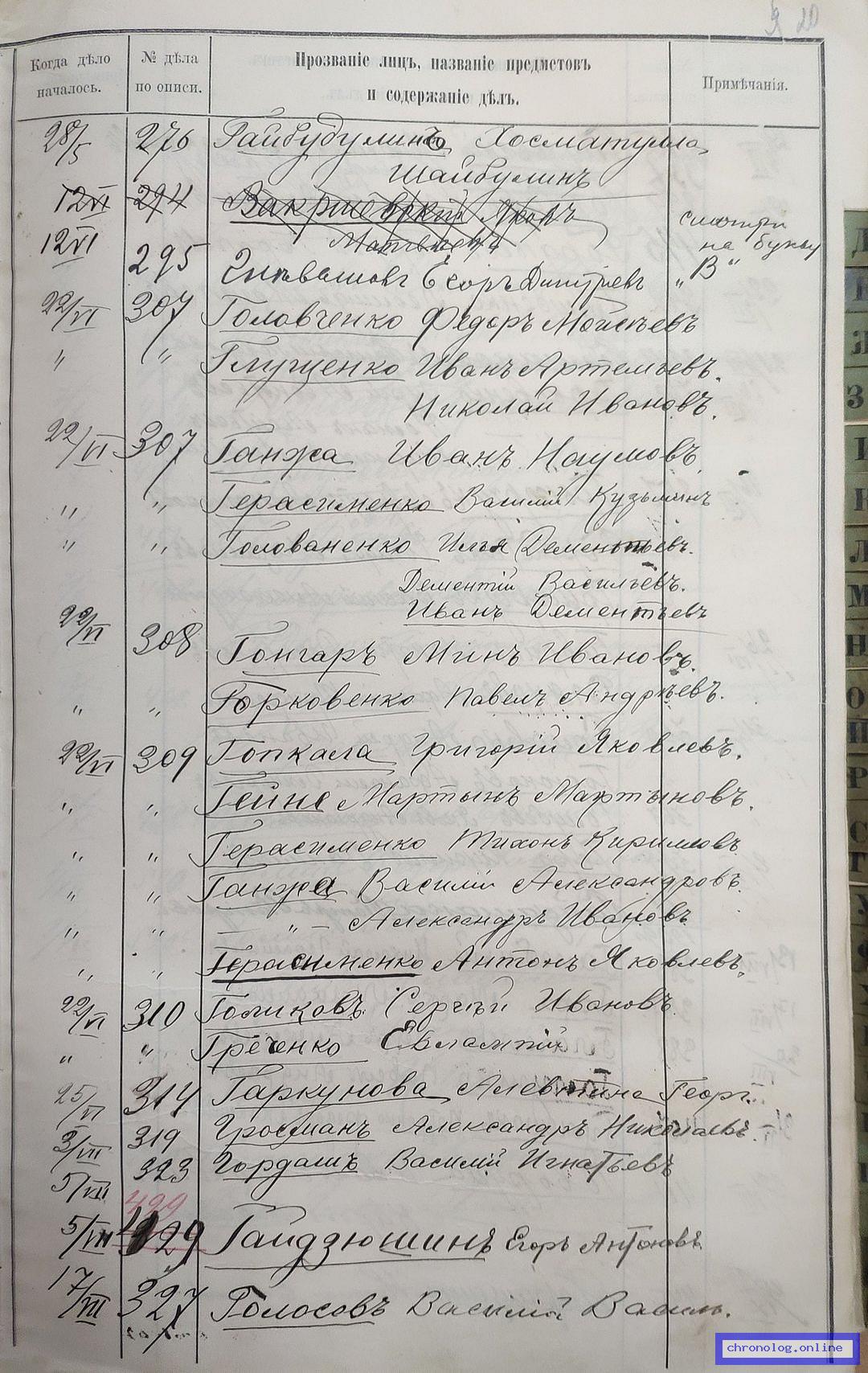 РГИАДВ 704-4-3230, Л.178об (Указатель дел переселенческой части за 1912 год): Чегринский Демьян Фёдорович показан со ссылкой на дело (старая опись, нумерация не действительная) №516 от 24.11.1912. Время и место исхода не показано. Снимки: 178об. | |||