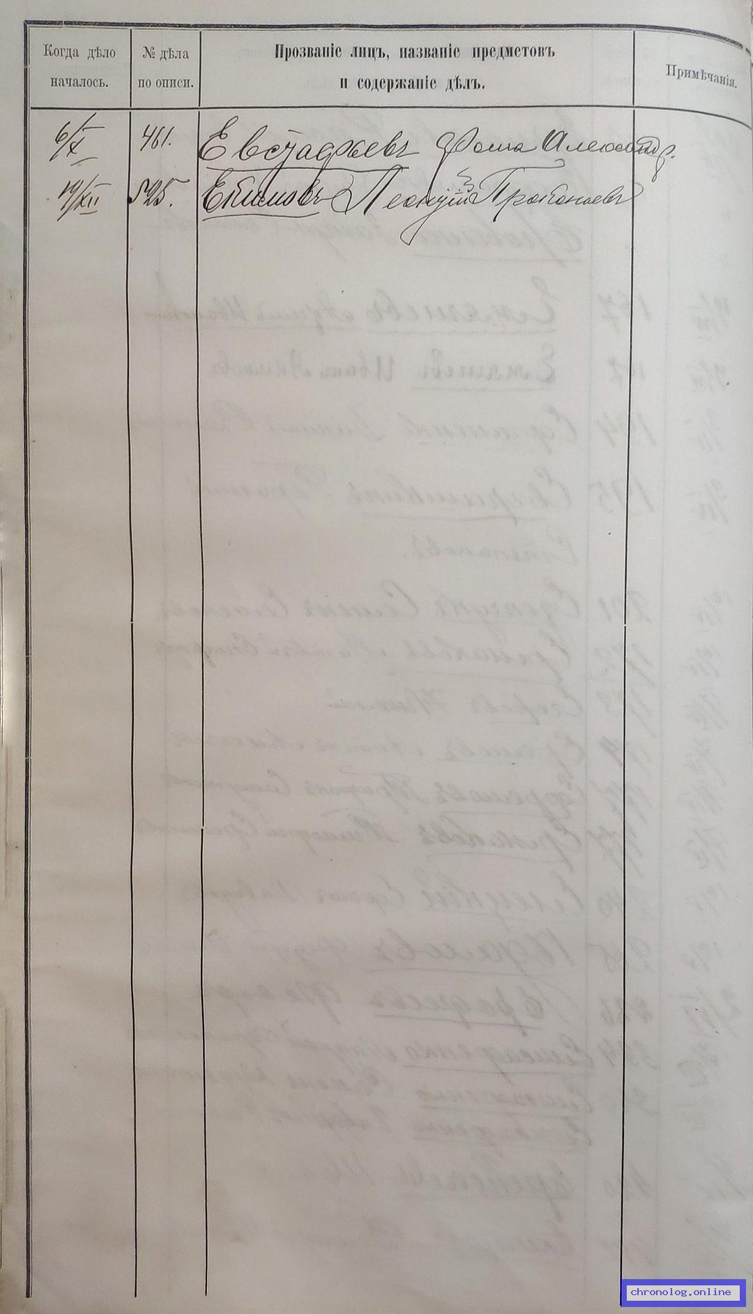 РГИАДВ 704-4-3230, Л.31об (Указатель дел переселенческой части за 1912 год): Евстафьев Фома Александрович показан со ссылкой на дело (старая опись, нумерация не действительная) №461 от 6.10.1912. Время и место исхода не показано. Снимки: 31об. | |||