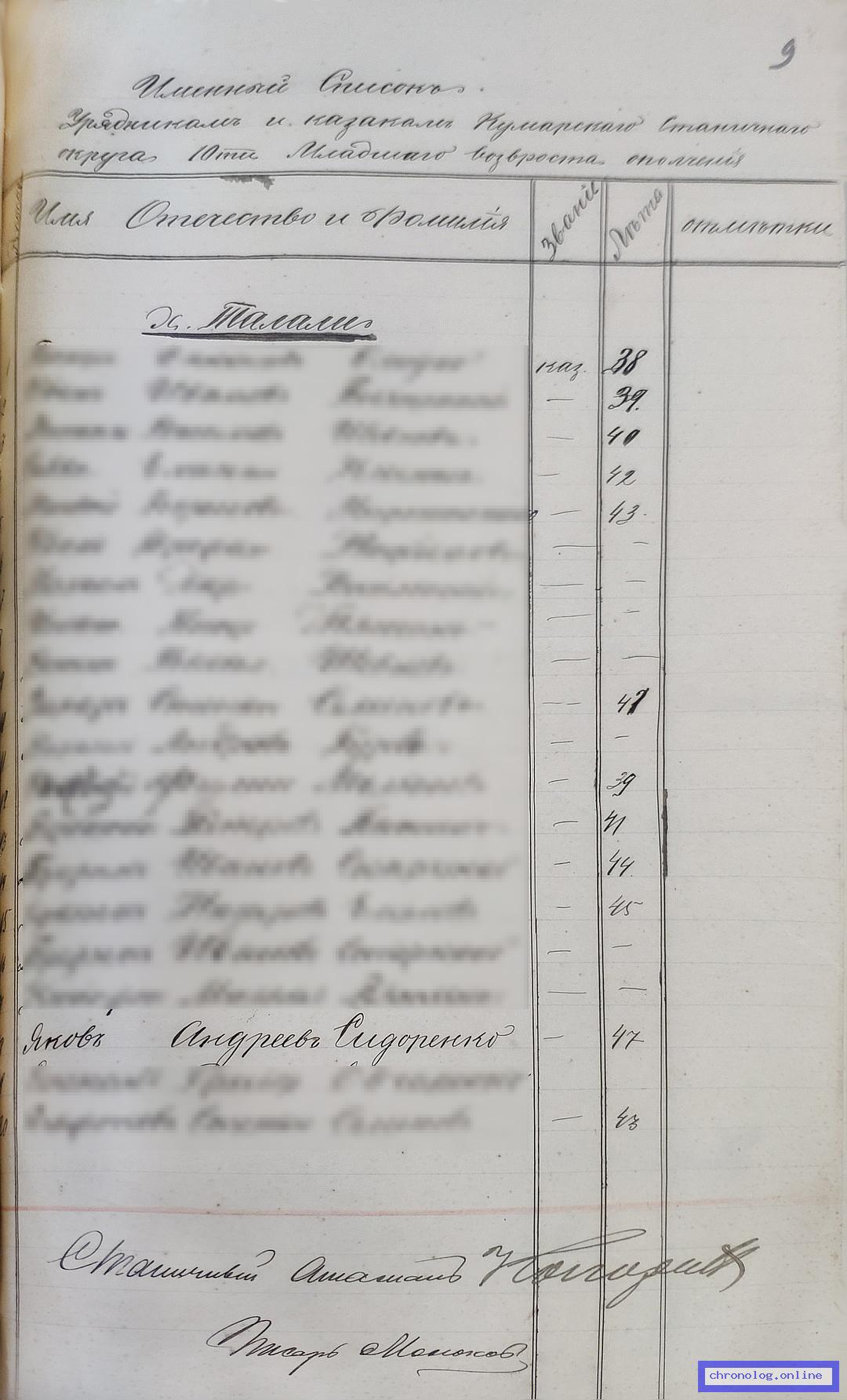 РГИАДВ 1591-1-2, Л.9 (Список урядникам и казакам Кумарского станичного округа на 1913 год): Казак Яков Андреевич Сидоренко 47 лет показан жительствующим на хуторе Талали. Время и место исхода не показано. Снимки: 9. | |||