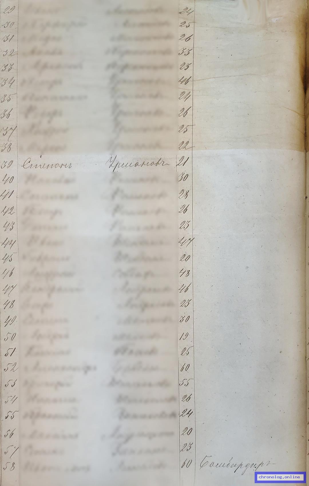РГИАДВ 704-4-344, Л.12об (Список крестьян Амурской области, подлежащих отбытию повинностей в 1882 году): Крестьянин деревни Михайловской Урманов Степан 21 лет. Время и место исхода не показано. Снимки: 12об. | |||