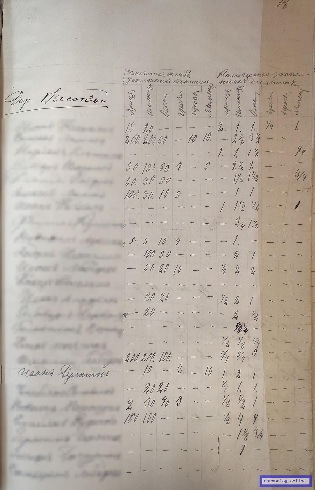 РГИАДВ 746-1-36, Л.36 (Именные списки крестьян и сведения о имеющейся земле за 1896 год): В сводной таблице о посевах пшеницы, ярицы, ячменя, овса, гречи и проса показан Булатов Иван из деревни Высокой. Время и место исхода не показано. Снимки: 36. | |||