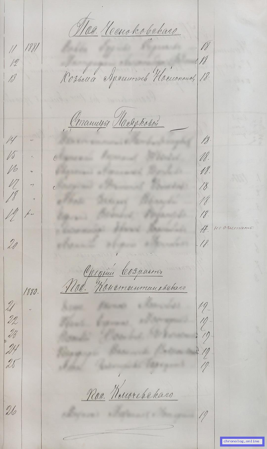 РГИАДВ 793-1-419, Л.149об (Списки казакам, вахмистрам, урядникам Амурского казачьего войска по возрастам, разрядам и округам на 1900 год): Казак Михаил Иванович Номоконов 22 лет из станицы Поярково показан в списке первой очереди по Поярковскому станичному округу. Время и место исхода не показано. Снимки: 149об. | |||