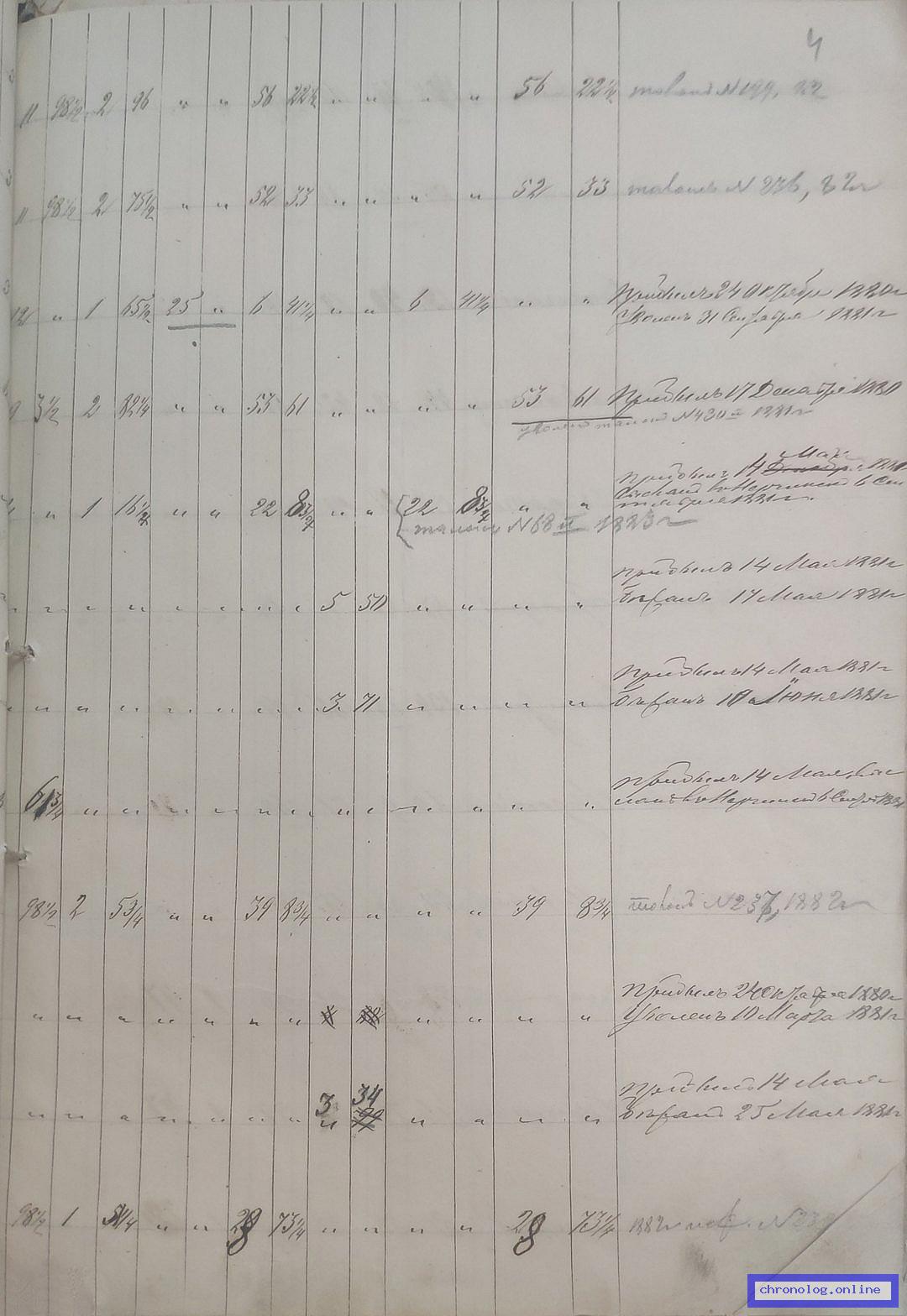 РГИАДВ 1124-1-3, Л.3об.-4 (Годовой отчёт о заработках ссыльнокаторжных на Дарасунских приисках за 1880 год): Василий Волков показан в сводной таблице заработков и выдачи их в форме припасов (показаны их эквиваленты в рублях и копейках по разным статьям). Время и место исхода не показано. Снимки: 3об, 4. | |||