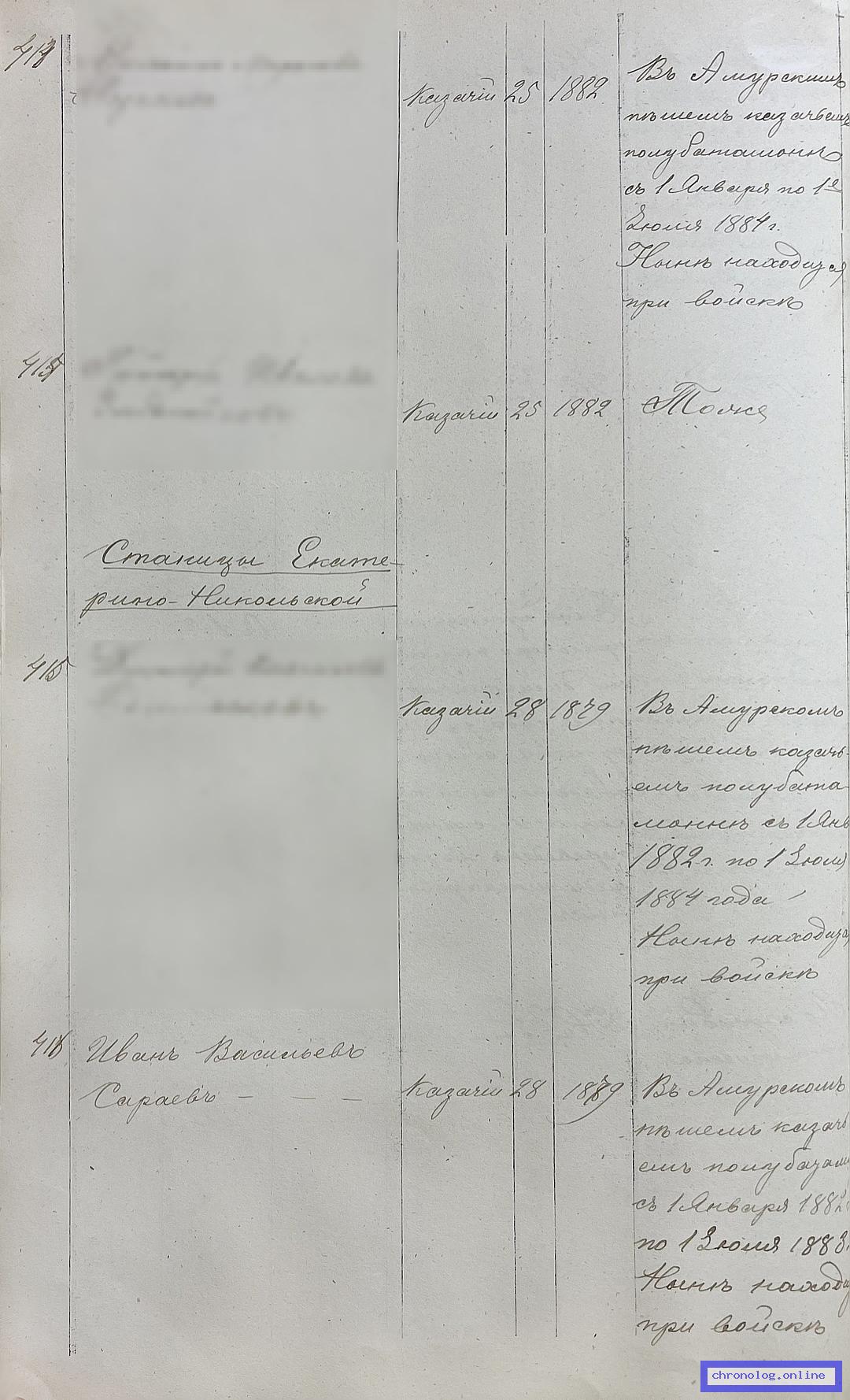 РГИАДВ 793-1-376, Л.104об., 105 (Общий список служилым казакам Амурского пешего полубатальона на 1889 год): Казак Сараев Иван Васильевич 28 лет показан в списке по станице Екатерино-Никольской. Время и место исхода не показано. Снимки: 104об, 105. | |||