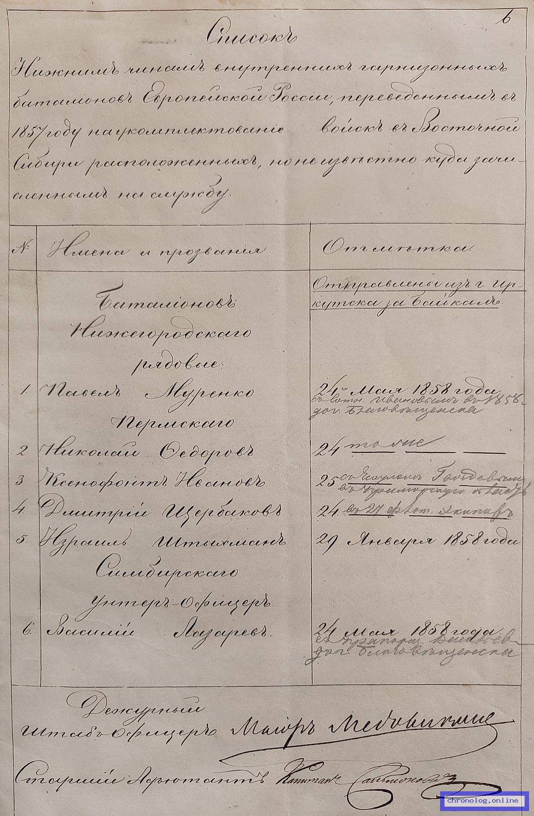 ГАЗК 30-2-278, Л.2об, 6 (Список нижних чинов, прибывших из Европейской части России для укомплектования линейных батальонов Восточной Сибири): Рядовой Пермского батальона Щербаков Дмитрий показан в списке на укомплектование линейных батальонов Восточной Сибири. Исход: Пермская губерния. Снимки: 2об, 6. | |||