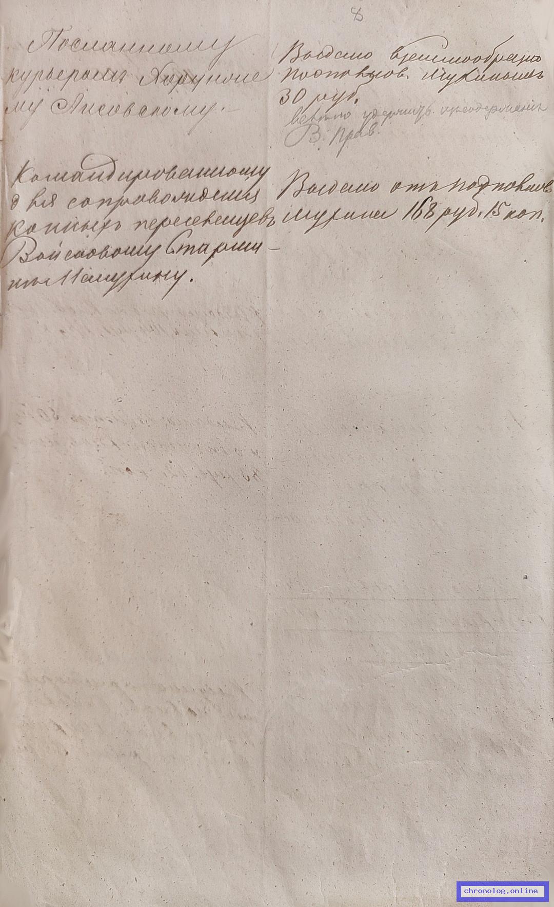ГАЗК 30-2-297, Л.4об, 5 (О выдаче беднейшим казакам дополнительного пособия): Казак 2-го батальона Мартын Мурзин показан в списке урядникам и казакам, нуждающимся в пособии. Исход: Деревня Большезерентуйская Нерчинского уезда. Снимки: 4об, 5. | |||