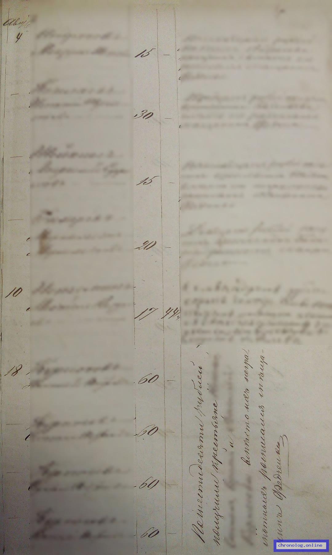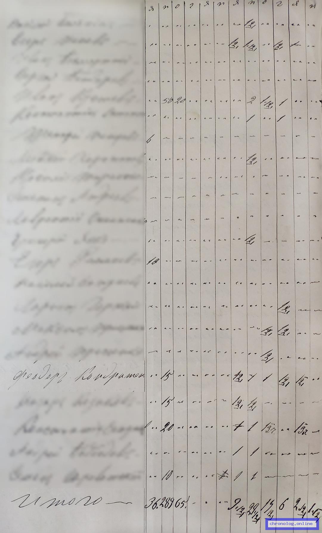 РГИАДВ 746-1-36, Л.51об (Именные списки крестьян и сведения о имеющейся земле за 1896 год): В сводной таблице о посевах пшеницы, ярицы, ячменя, овса, гречи и просо показан Кондратенко Фёдор из деревни Большие-Сазанки. Время и место исхода не показано. Снимки: 51, 51об. | |||