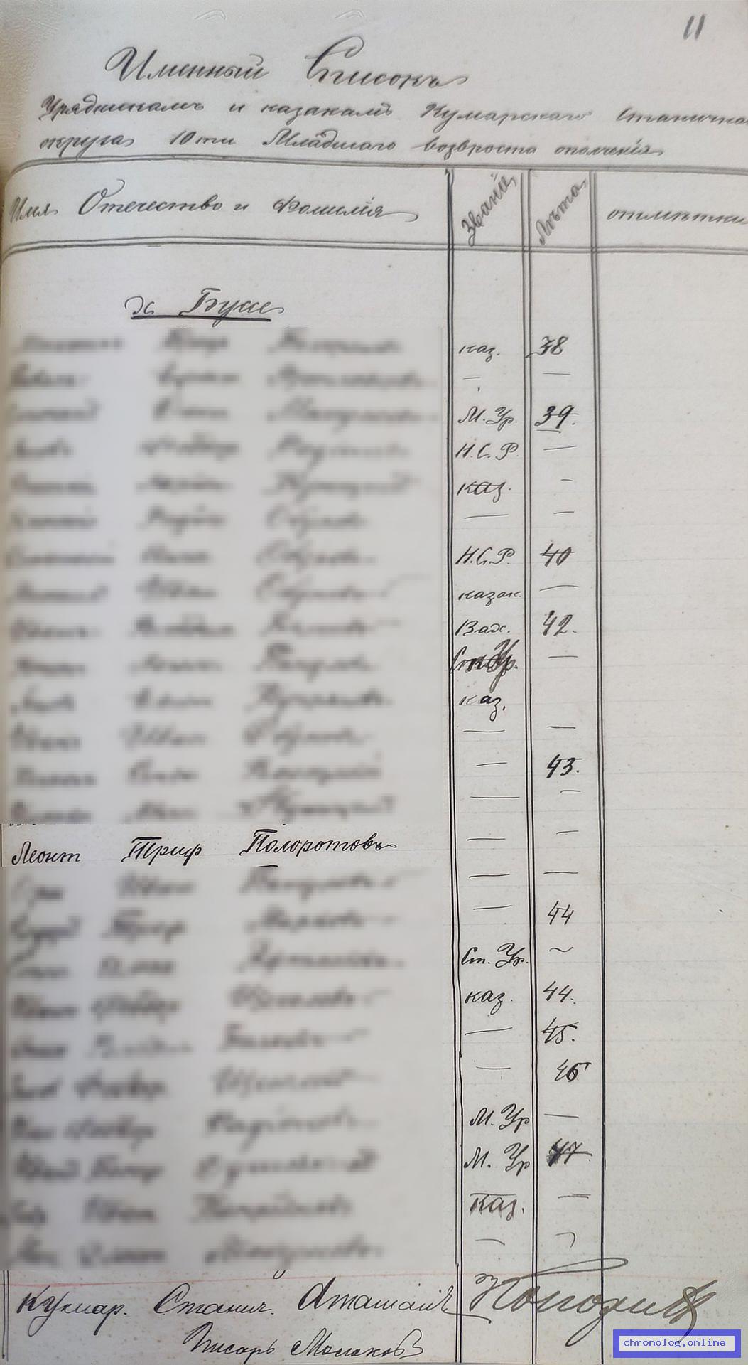 РГИАДВ 1591-1-2, Л.11 (Список урядникам и казакам Кумарского станичного округа на 1913 год): Казак Леонтий Трифонович Полоротов 43 лет показан жительствующим на хуторе Буссе. Время и место исхода не показано. Снимки: 11. | |||