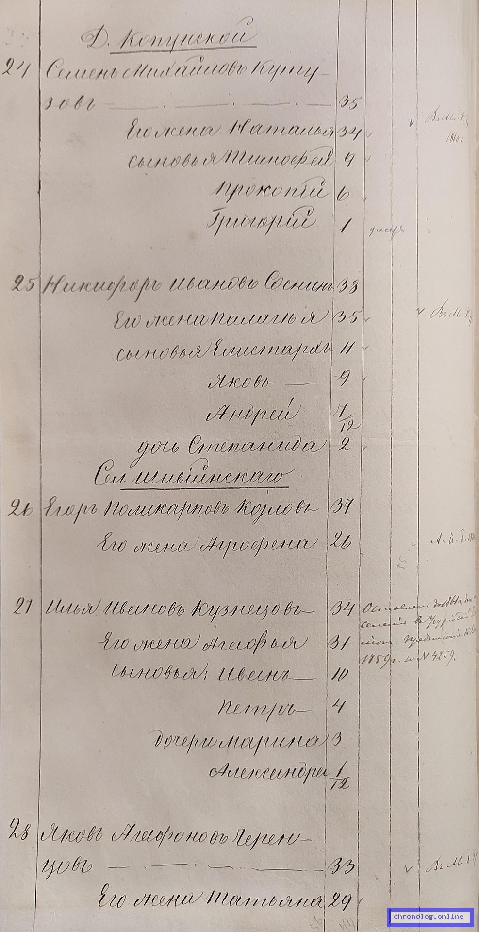 ГАЗК 30-2-270, Л.108, 133, 233об (Посемейные списки переселенцев на р. Амур): Казак 10-го пешего батальона Дмитрий Прохорович Семёнов 24 его жена Настасья 23 сыновья Фёдор 4 Семён 1 брат Иван 21 его жена Ховронья 20 сёстры Василиса 17 Матрена 12 отец Прохор 59. Исход: деревня Галкина Нерчинского уезда. Снимки: 108, 133, 233об. | |||